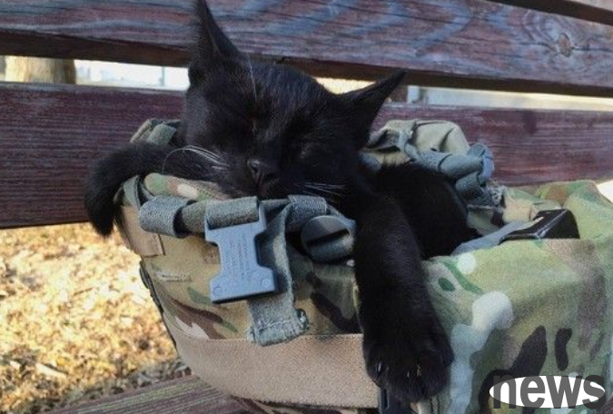 The little black cat accompanies the American soldiers on guard duty every day, occupying the helmet and domineeringly conquering the shit shoveling officer.