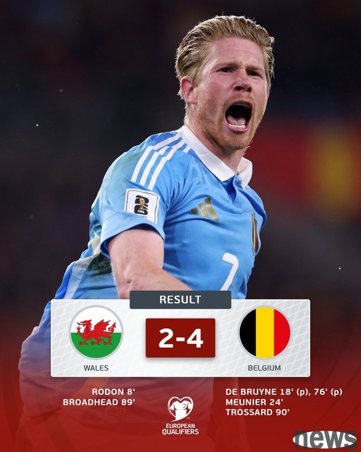 In the first half of this campaign, Rodon took the lead for Wales, De Bruyne shot to equalize the score, Doku assisted Meunier to score, and Belgium went ahead 2-1. In the second half, De Bruyne scored another goal from the penalty spot, scoring twice, Broadhead regained one for Wales, and Trossard sealed the victory for Belgium. In the end, Belgium defeated Wales 4-2 away from home.
