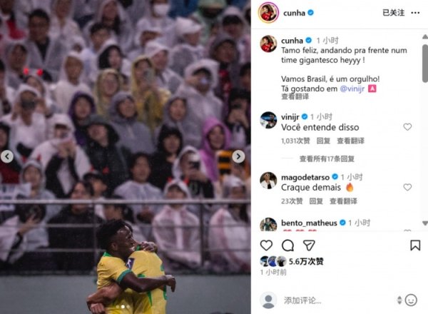 Cunha posted a photo celebrating with Vinicius on social media: he scored a goal in a row and was proud of this Brazilian team