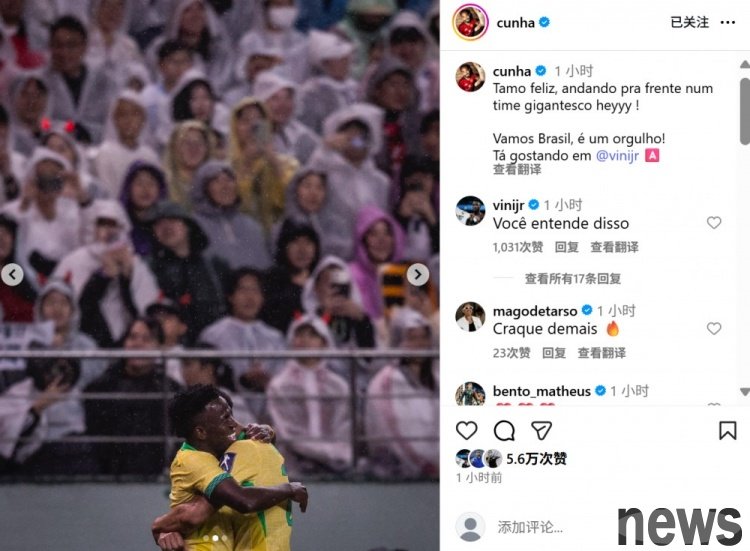 After the game, Cunha also posted a photo on social media of celebrating the goal with Vinicius, with the text saying: "We are very happy to continue to move forward with this great team. Come on, Brazil, we are proud of you. Scored a goal with Vinicius!"