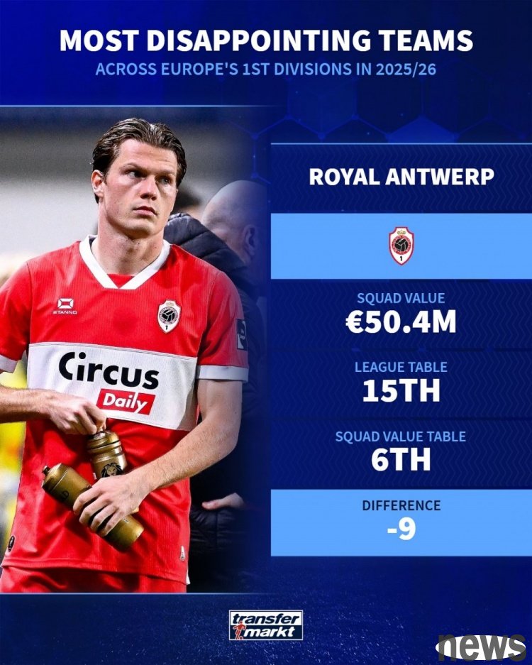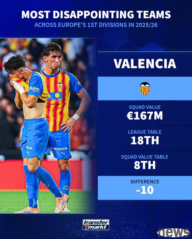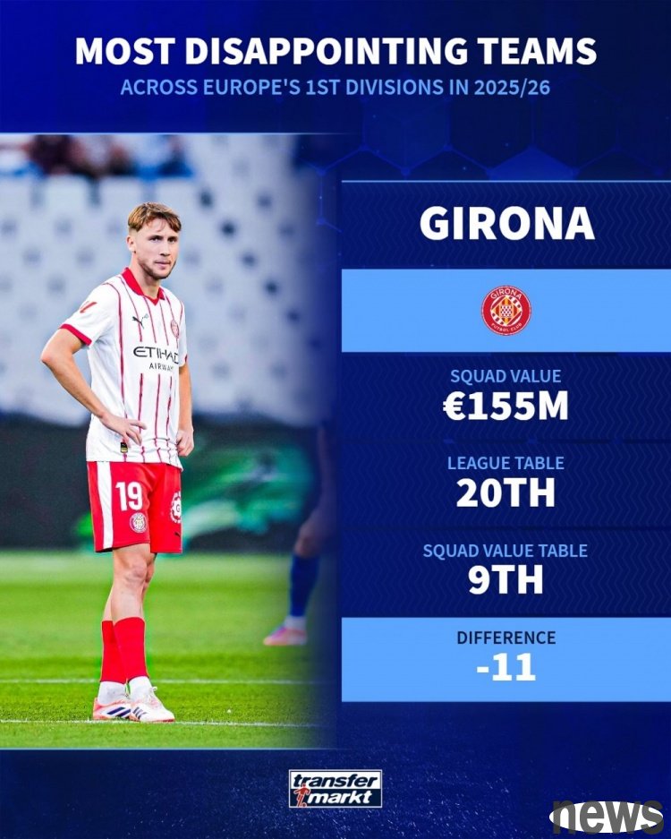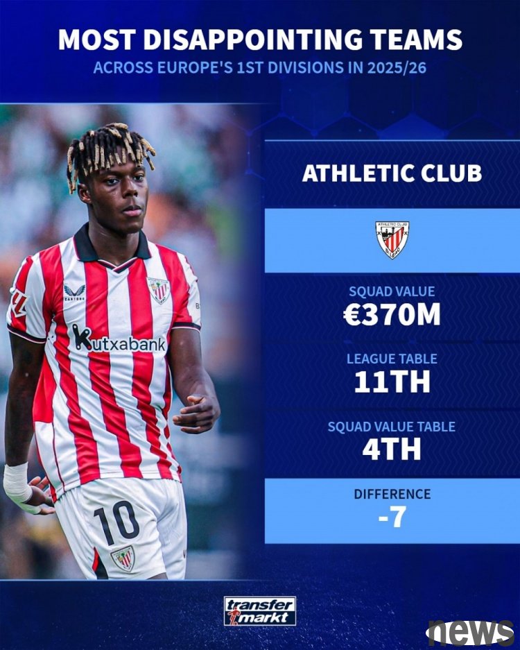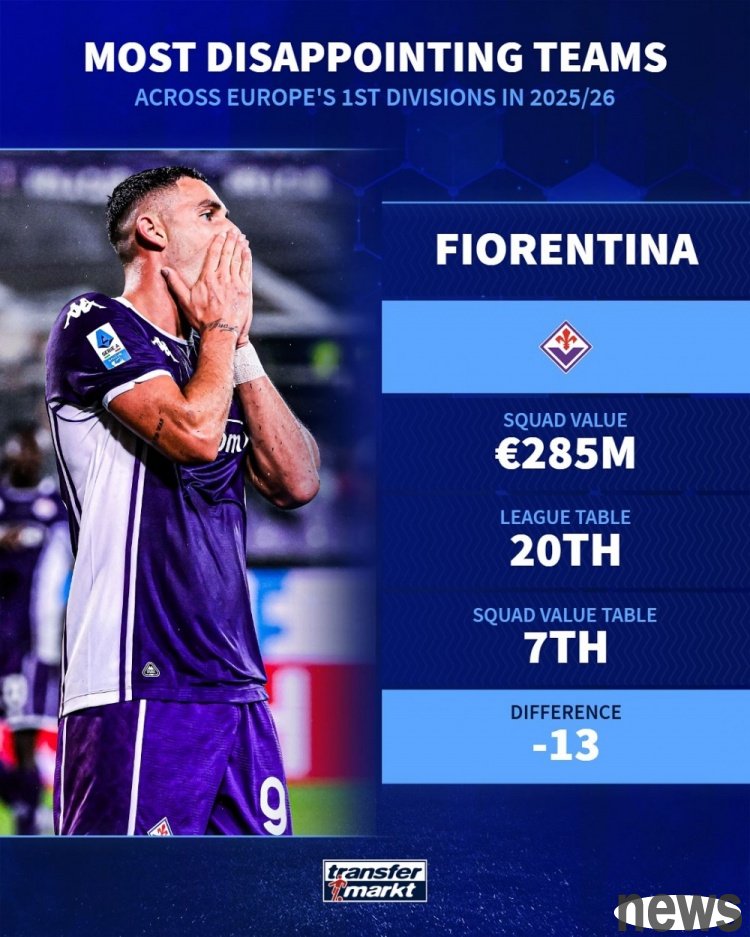 The German transfer market has listed the most disappointing teams in Europe's top leagues this season based on the team's worth and current ranking. Fiorentina, Newcastle United, and Athletic Bilbao are on the list.