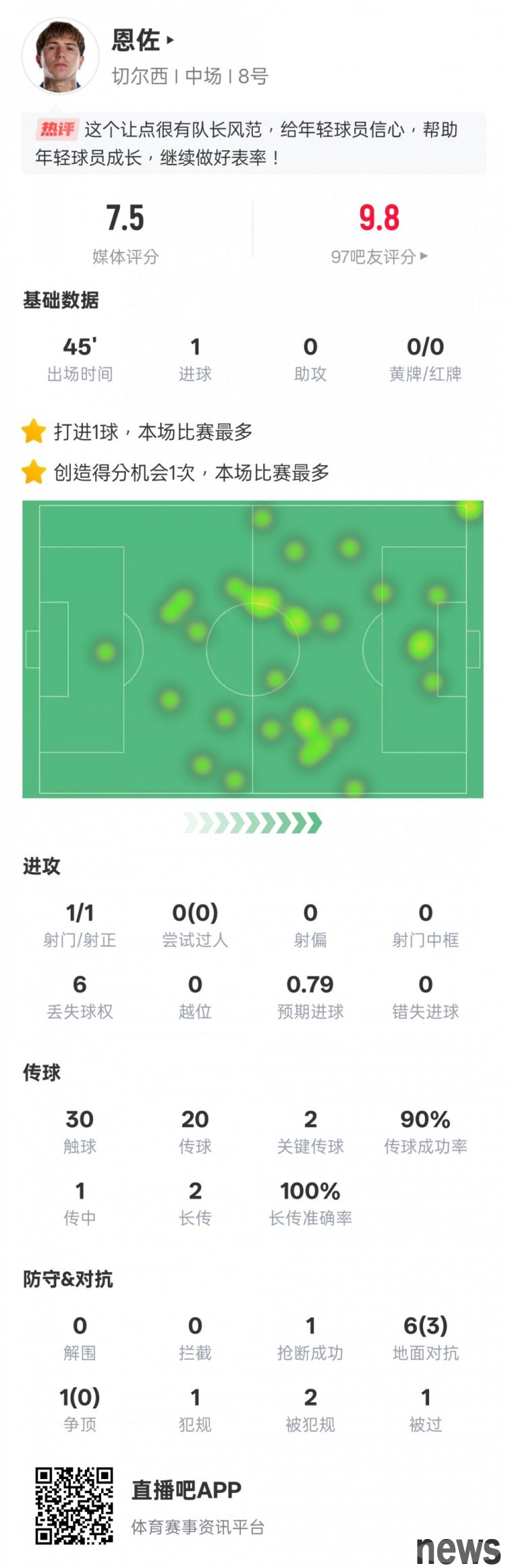Enzo s statistics for this game: 1 shot, 1 shot on target, 1 goal + 2 key passes, rating 7.5