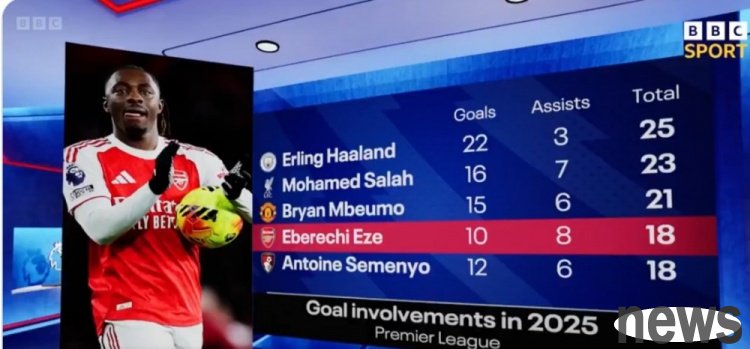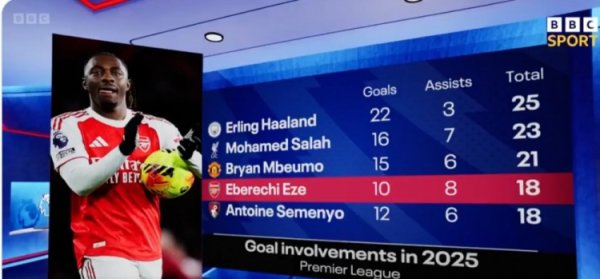 According to BBC statistics, Eze has participated in 18 goals in the Premier League this year, only fewer than Haaland, Salah, and Mbemo.