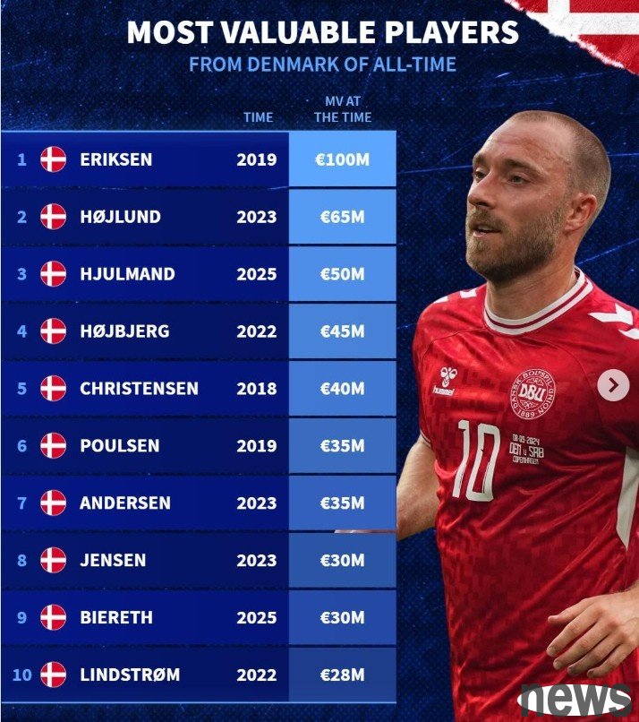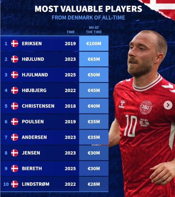 Historical value list of Danish players: Eriksen ranks first with 100 million euros, Hoylen second with 65 million euros