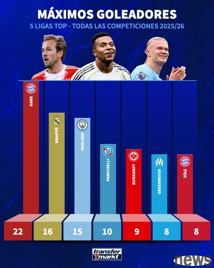 How many months has this been? Top scorer list in the five major leagues: Kane ranks first with 22 goals, Mbappe with 16 goals and Haaland with 15 goals