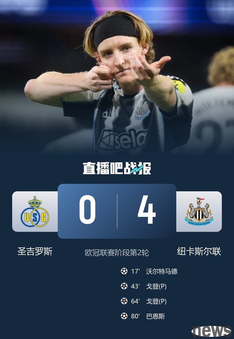 Champions League first win! Newcastle 4-0 San Giros Gordon scored double penalty kicks Walter Mad made consecutive games