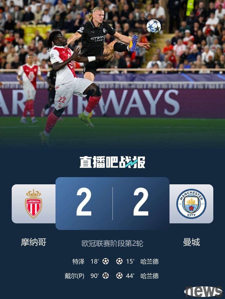 was beaten! Manchester City missed a winning streak of Monaco 2-2. Haaland scored 11 goals in 8 doubles. Nico gave away points