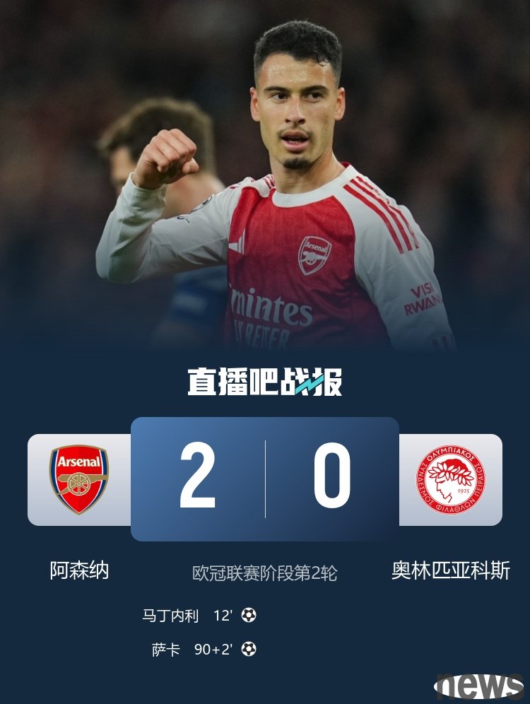 Arsenal defeated Olympiacos 2-0 in this round, and Martinelli and Saka each scored a goal, and the captain Ode Gao performed well.
