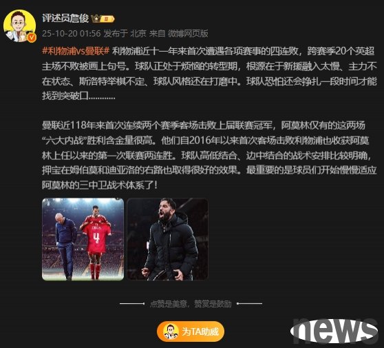 In the 8th round of the Premier League, Liverpool 1-2 Manchester United at home. After the game, commentator Mr. Zhan Jun made comments on social media.
