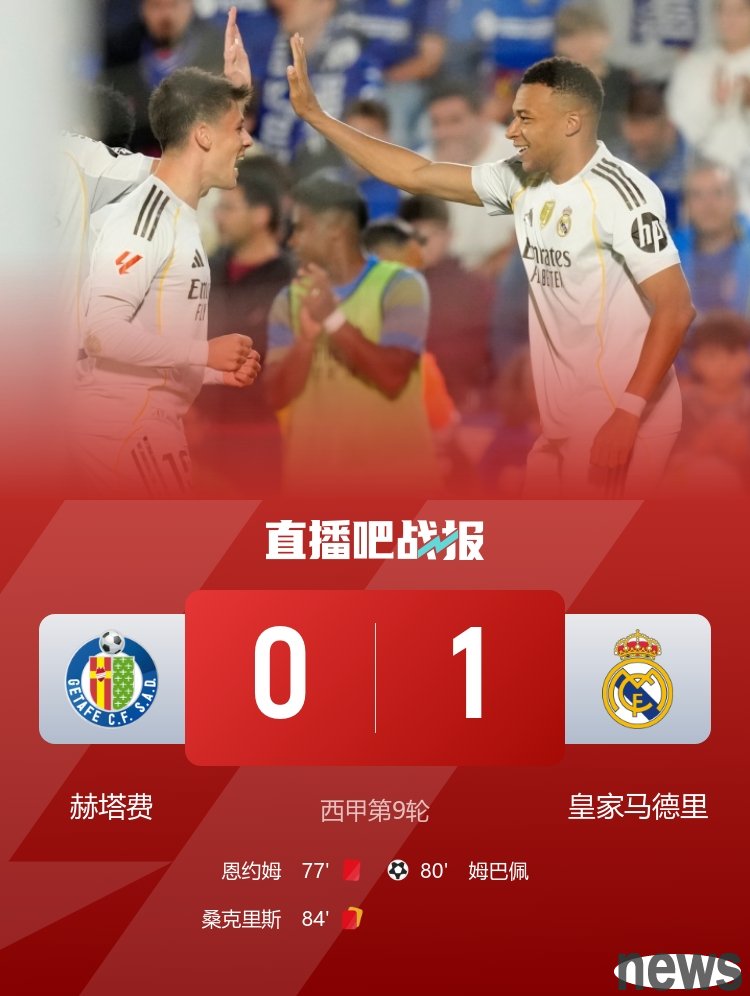 Leading by 2 points! Real Madrid 1-0 nine-man Getafe. Mbappe won. Vinicius came off the bench and made two reds.