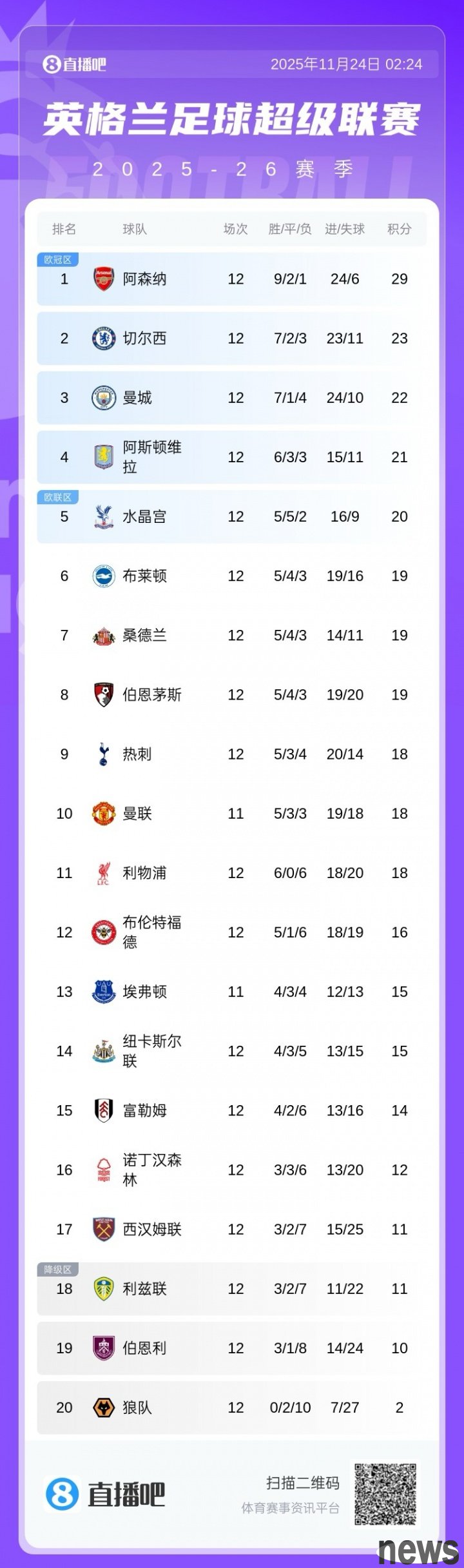 Most of the matches ended in the 12th round of the Premier League. Arsenal defeated Tottenham 4-1 and led the standings with 6 points. Chelsea is 2nd, Manchester City is 3rd, and Villa moved up to 4th with a 2-1 away win over Leeds United. Tottenham, Manchester United, and Liverpool ranked 9-11 respectively. Manchester United vs Everton tomorrow, the latest standings are as follows: