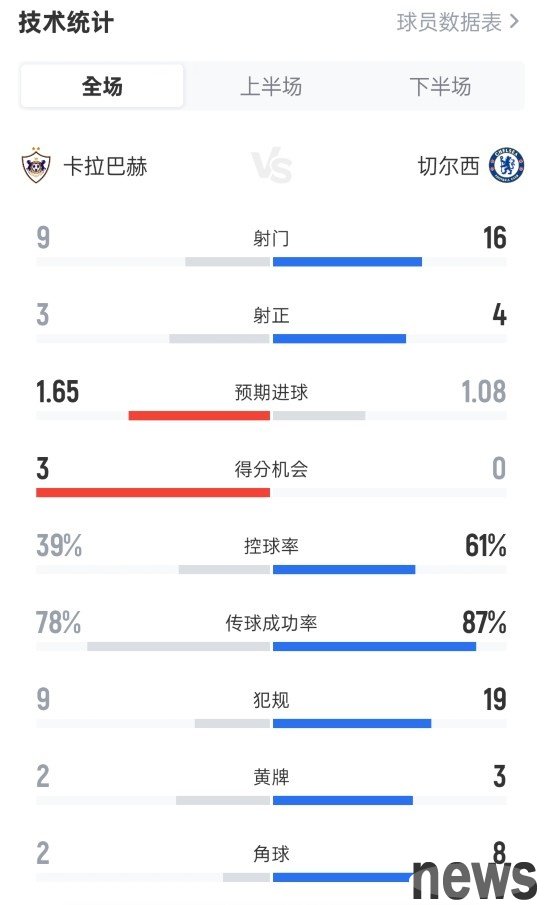 Qarabag 2-2 Chelsea full game statistics: 9-16 shots, 3-4 shots on target, ball possession rate 39%-61%