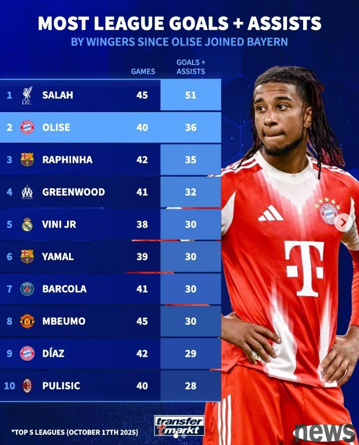 In the latest player value update of Dezhuan, Olise's value increased by 30 million euros to 130 million euros. Dezhuan also took stock of the scoring list of all wingers in the five major leagues since Olise joined Bayern. Olise ranked second after Salah. The details are as follows (goals + assists):