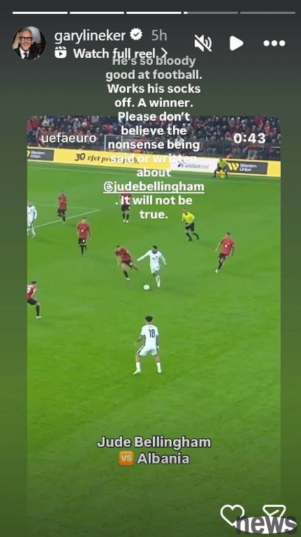 Lineker shared a post on his Instagram story showing highlights from Bellingham's game against Albania, shown by UEFA's official European Cup account, and wrote: "He's just so good in football." A winner. Please don't believe the nonsense being said about @Bellingham. "