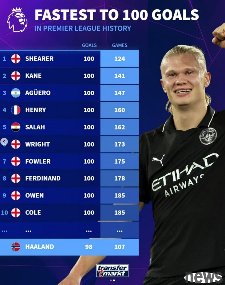 The fastest record of 100 goals in the Premier League: Shearer leads the list with 124 games, Haaland currently has 98 goals in 107 games