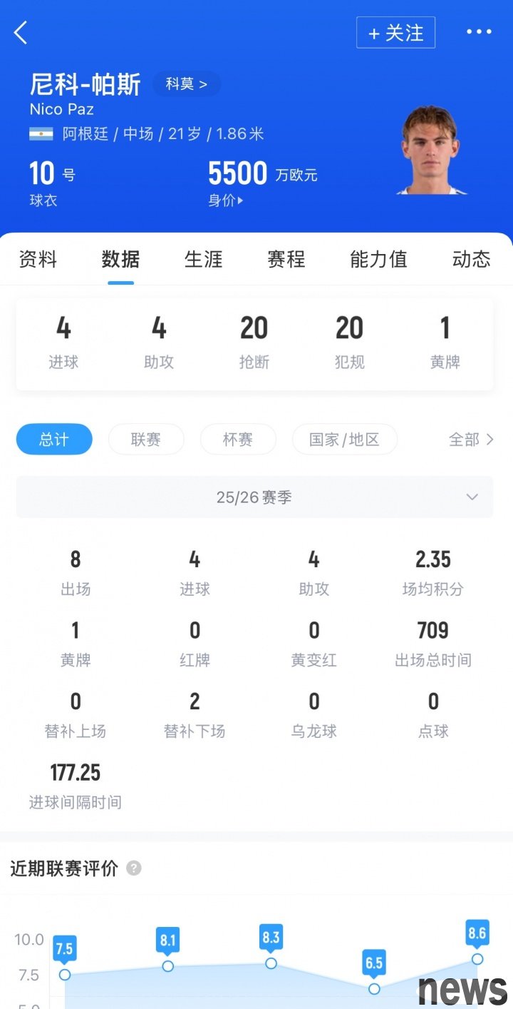 Romano said in the podcast: "Paz's talent is amazing and has attracted the attention of all Europe. Tottenham had tried to sign him before, with a total offer of up to 70 million euros. However, both Como and Real Madrid rejected the offer. You know, although Paz nominally belongs to Como, Real Madrid has 50% of his transfer share and a buy-back clause of 10 million euros.